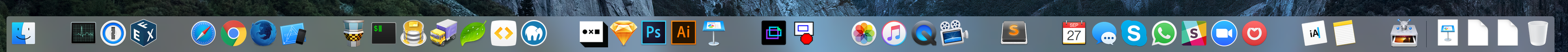 Ich hatte früher ein riesiges Dock, aber irgendwann letztes Jahr habe ich mich darauf trainiert, ausschließlich Spotlight zu benutzen, sodass die einzigen Dinge, die in meinem Dock angezeigt werden, die geöffneten Apps und der Papierkorb sind. Zwischen Spotlight und Command-Tab zum Wechseln zwischen Apps sehe ich das Dock heutzutage selten, es sei denn, mein Mauszeiger landet zufällig am unteren Bildschirmrand. Einige Reste aus der Vergangenheit in deinem Dock. Transmit, FontExplorer & SequelPro... Das ist Ewigkeiten her!